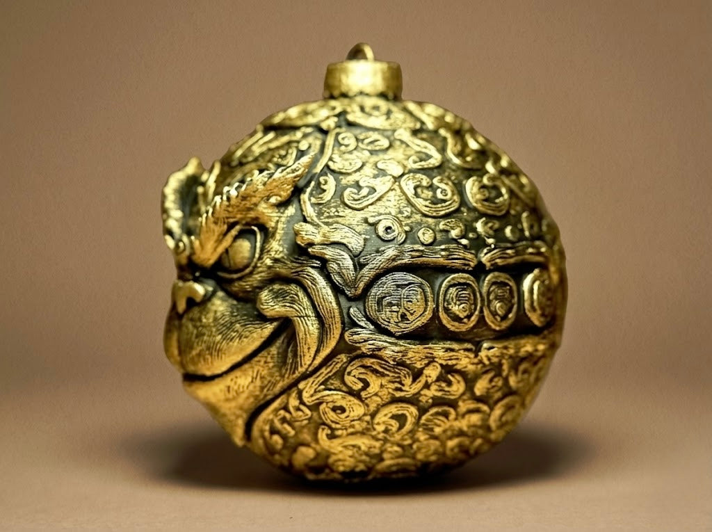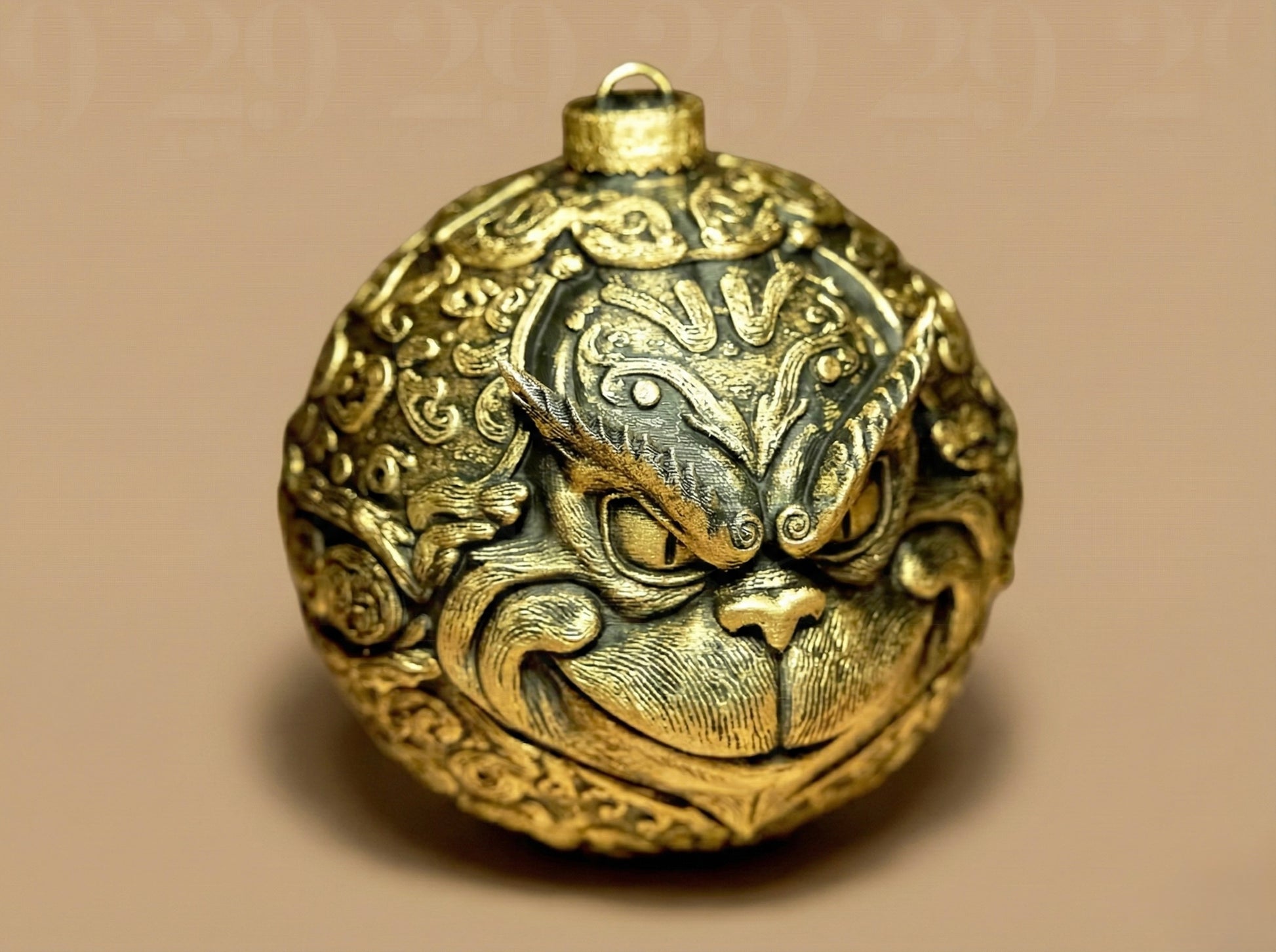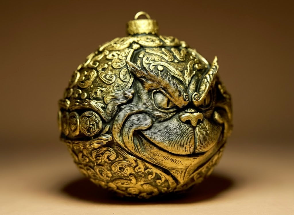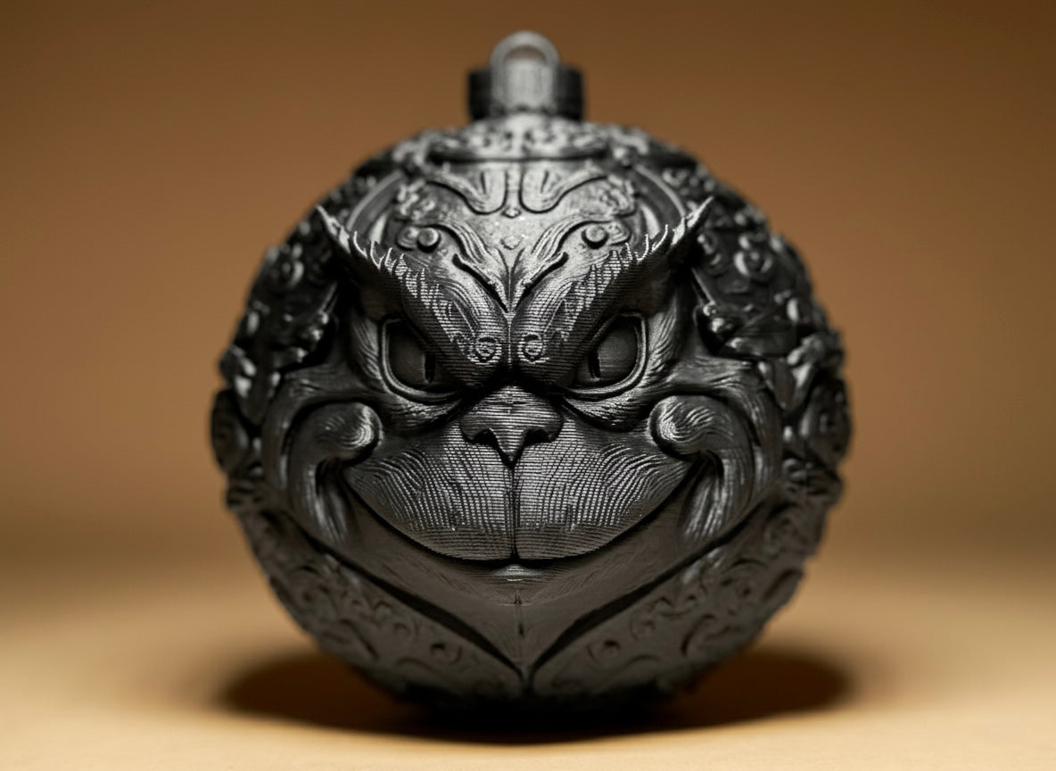 Grinch Glob decorativ, cu un Grinch stilizat sculptat în relief profund. Expresia iconică și detaliile texturate îi dau un aer jucăuș și vintage. Finisajul metalic (argintiu, bronz sau cupru) îi adaugă profunzime și caracter. Perfect pentru brad, colecționari sau ca piesă amuzantă în decorul de sezon.