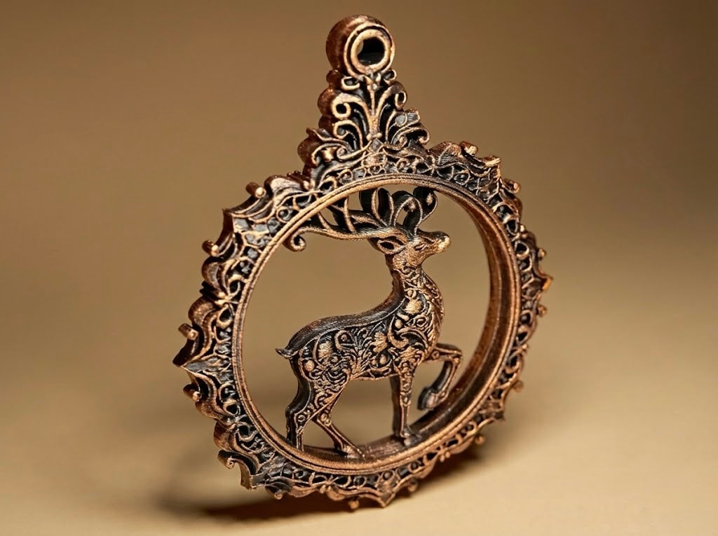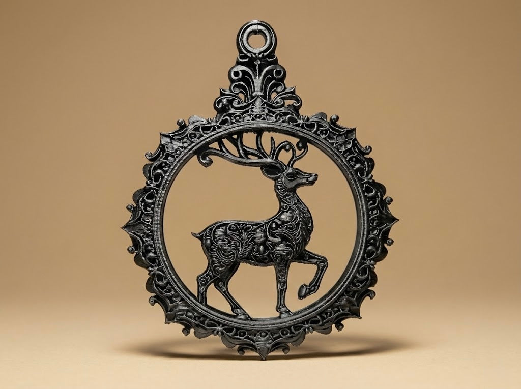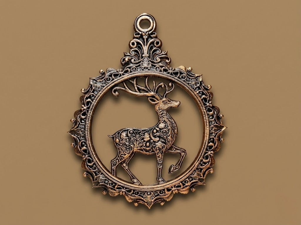 Ornament delicat Ren stilizată, încadrată într-o ramă baroc bogată. Detalii fine, accente metalice vintage și un aer elegant, perfect pentru brad, ferestre sau decor de iarnă si aspect rafinat.