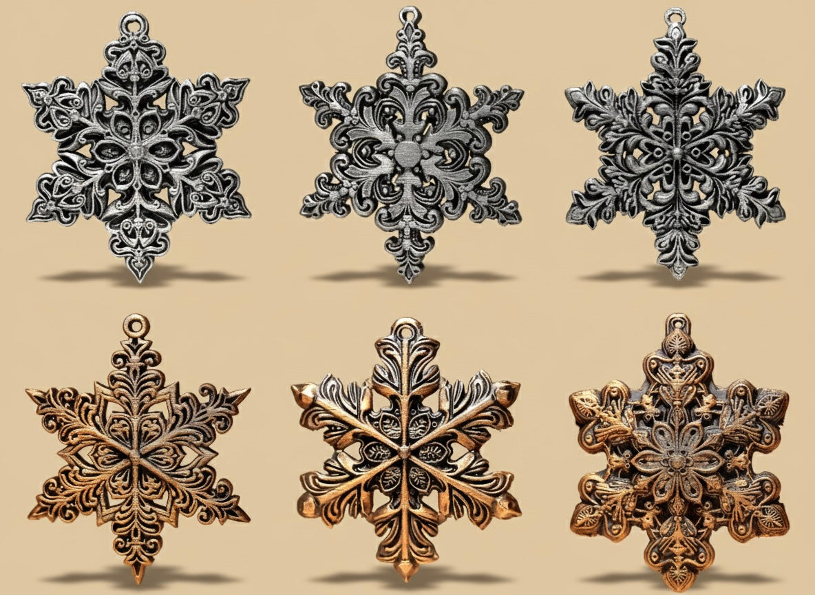 Set de 6 steluțe modele diferite, fiecare cu un design baroc unic. Reliefuri fine, detalii elegante și finisaj metalic (argintiu, bronz, cupru) care oferă un aspect sofisticat. Perfecte pentru brad, ghirlande, ferestre sau decor de masă.